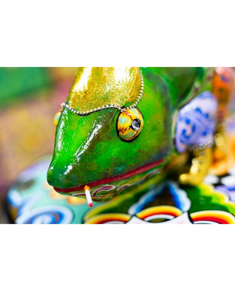 Le caméléon Camilla avec sa cigarette au coin du bec est très élégant, orné de strass il parait de lumière. Ses couleurs lui confèrent un look extravagant !