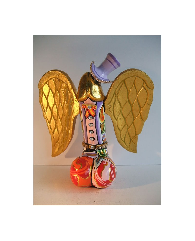 Le Drag Zizi met à l'honneur la virilité avec cette sculpture à l'effigie du sexe masculin ! Chaque modèle est orné de motifs baroques et floraux aux couleurs vives. Il est vêtu d'un costume avec un nœud papillon, des boutons et une ceinture parés de bijoux telle une figurine masculine. Pour lui donner un côté humoristique et sage, ils déploient des ailes dorées mettant en valeur les gravures tel un ange !
