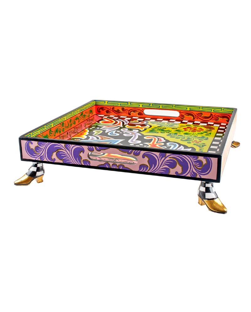 On retrouve les motifs et les décorations des Tom's drag avec ses botines dorées à chaque coin du plateau ainsi que le damier noir et blanc signature de l'artiste.