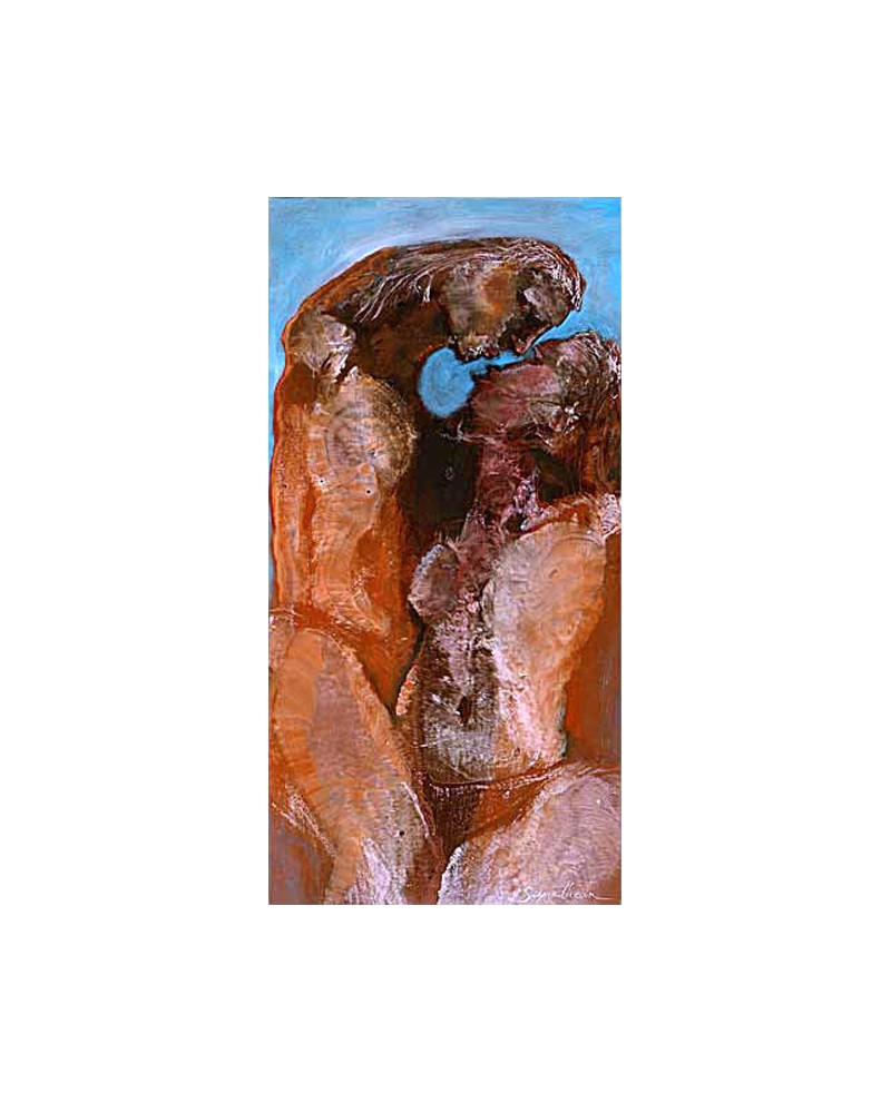 Peinture "Scéno-graphique" et "Vie sur toile" sont des expressions toutes neuves qui coïncident parfaitement avec l’univers restitué en peinture par Zeyno Arcan, dans la fluidité d’un geste pictural où les matières se déversent sur la toile, le papier, pour se fondre les unes contre les autres avec toute la délicatesse d’une confrontation, celle du corps sur le support. Dans sa peinture se concentrent tous les moyens d’expressions chers à l’artiste au service des valeurs qu’elle défend : la danse, corps et mouvement, la couleur, lumière et matière. La magie de la peinture de Zeyno vient du fait qu’au profit de l’expression corporelle, la facture, fluide et aérienne, concourt à la représentation sensuelle de ces corps mouvants dans un espace indéfini. Chaque composition semble être la projection de soi en vie, soi avec autrui, dans ce monde, aujourd’hui. Les corps dansent, suspendus entre ascension et chute, au point de liaison médiane du tableau. L’équilibre se crée ici, à la jonction du haut et du bas, de l’élévation amorcée et de la retombée du corps dans la légèreté.