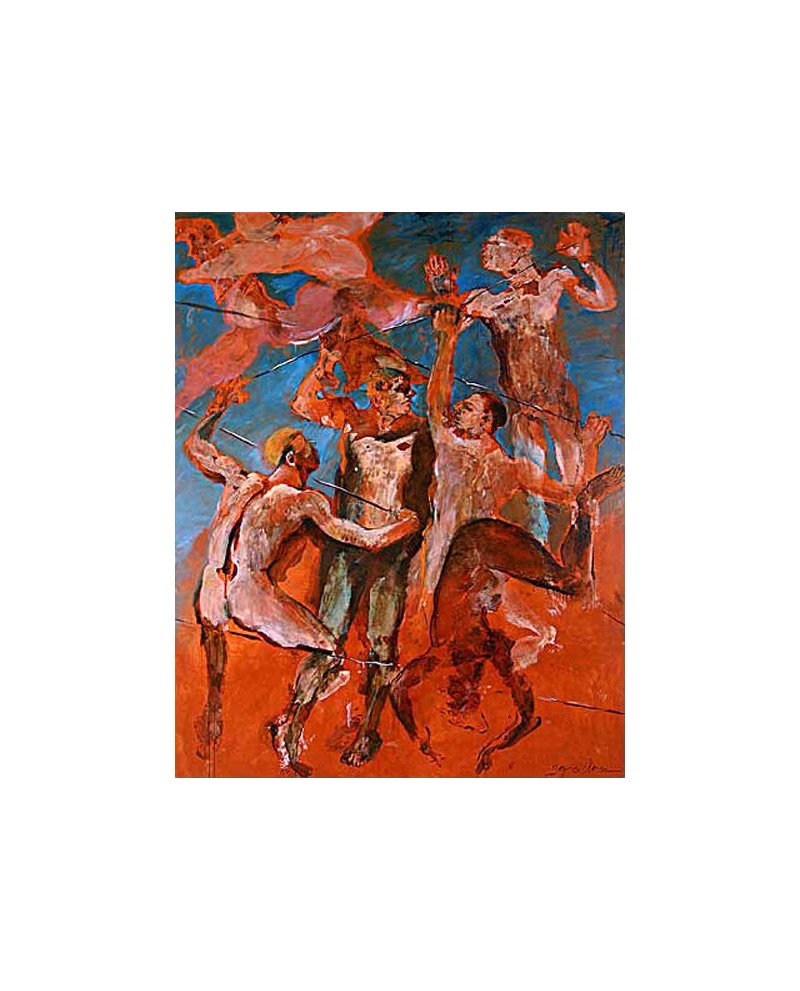 Peinture "Scéno-graphique" et "Vie sur toile" sont des expressions toutes neuves qui coïncident parfaitement avec l’univers restitué en peinture par Zeyno Arcan, dans la fluidité d’un geste pictural où les matières se déversent sur la toile, le papier, pour se fondre les unes contre les autres avec toute la délicatesse d’une confrontation, celle du corps sur le support. Dans sa peinture se concentrent tous les moyens d’expressions chers à l’artiste au service des valeurs qu’elle défend : la danse, corps et mouvement, la couleur, lumière et matière. La magie de la peinture de Zeyno vient du fait qu’au profit de l’expression corporelle, la facture, fluide et aérienne, concourt à la représentation sensuelle de ces corps mouvants dans un espace indéfini. Chaque composition semble être la projection de soi en vie, soi avec autrui, dans ce monde, aujourd’hui. Les corps dansent, suspendus entre ascension et chute, au point de liaison médiane du tableau. L’équilibre se crée ici, à la jonction du haut et du bas, de l’élévation amorcée et de la retombée du corps dans la légèreté.
